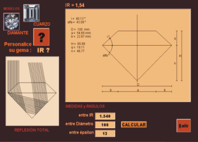 Basta entrar con el Índice de Refracción de la gema que se quiere lapidar, y con el Diámetro o Ancho de la pieza a obtener y se ve en pantalla la FORMA OPTIMIZADA de la pieza: los ángulos según los cuales debe facetarse, y las proporciones de mesa, altura, corona, culata y proyección horizontal de la faceta fundamental superior.